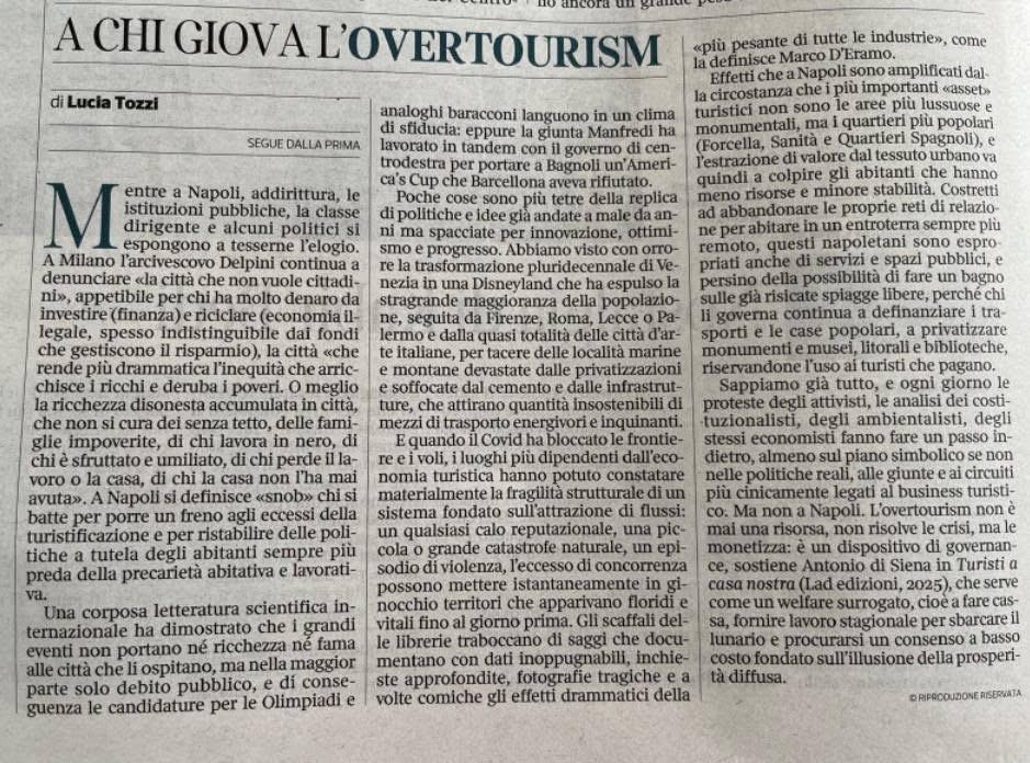 L’articolo di Lucia Tozzi sull’overtourism sottolinea uno dei temi centrali di Turisti a casa nostra: il turismo non è una semplice “industria” ma un modello di welfare surrogato.