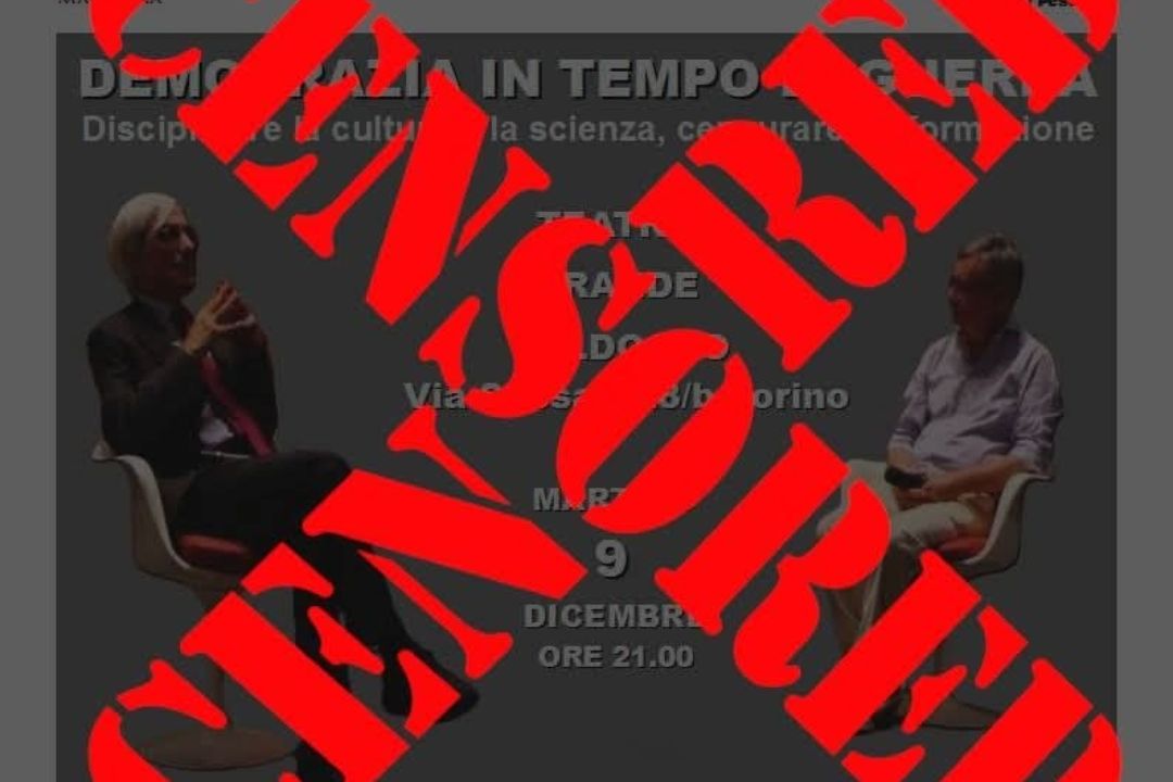 A pochi giorni dall'evento “Democrazia in tempo di guerra. Disciplinare la cultura e la scienza, censurare l'informazione”, previsto per il giorno 9 dicembre al Teatro Grande Valdocco di Torino, nel quale il sottoscritto avrebbe dialogato con il collega Alessandro Barbero, con l’adesione di importanti nomi della cultura, della scienza, del giornalismo, della comunicazione (Elena Basile, Alberto Bradanini, Luciano Canfora, Alessandro Di Battista, Donatella Di Cesare, Margherita Furlan, Enzo Iacchetti, Marc Innaro, Roberto Lamacchia, Tomaso Montanari, Piergiorgio Odifreddi, Moni Ovadia, Marco Revelli, Carlo Rovelli, Vauro Senesi, Marco Travaglio), ci viene comunicato questa mattina dalla proprietà del teatro, col quale si era giunti alla firma di un regolare contratto dopo una lunga gestazione, che lo spazio non ci verrà concesso.