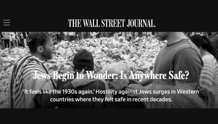 "Gli ebrei cominciano a chiedersi: esiste un posto sicuro? " titola di recente il Wall Street Journal, con il sottotitolo "'Sembra di essere tornati agli anni '30'. L'ostilità contro gli ebrei aumenta nei paesi occidentali dove si sentivano al sicuro negli ultimi decenni".