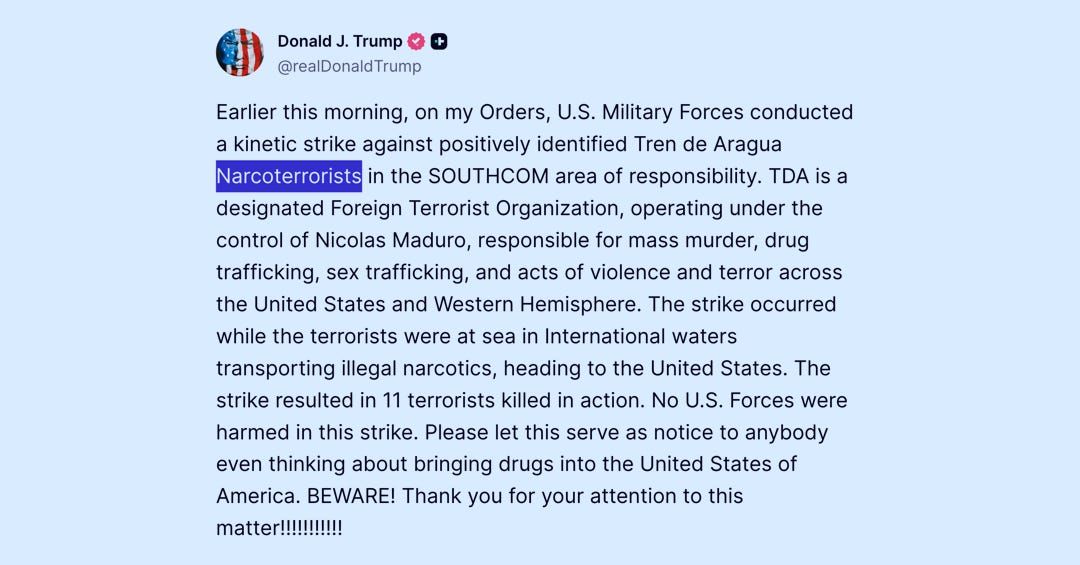 Allo stesso tempo, l'amministrazione Trump sta difendendo l'assassinio di un'imbarcazione piena di venezuelani con l'accusa che fossero "narcoterroristi", una categoria immaginaria concepita per accomunare i comuni trafficanti di droga agli attentatori suicidi e agli autori di stragi.