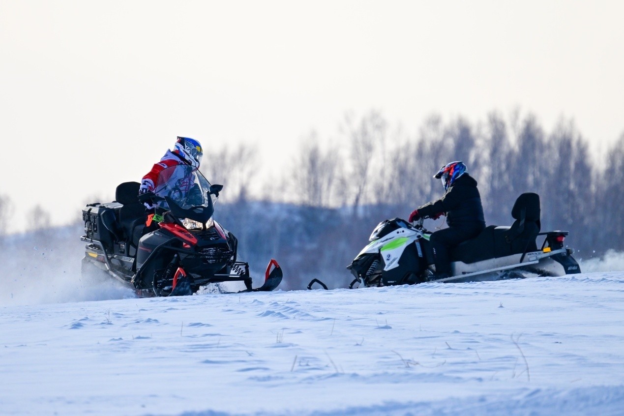 Alcuni turisti a bordo di motoslitte in una stazione sciistica a Yakeshi, nella prefettura di Hulun Buir, nella Regione Autonoma della Mongolia Interna, nord della Cina. (22 dicembre 2025 – Foto/Wang Xiaobo)