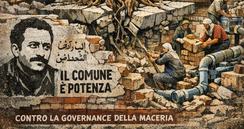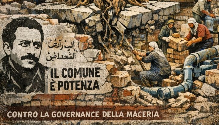 Il comune non è un’utopia gentilmente orizzontale. È un potere. È la capacità di decidere collettivamente sull’uso delle risorse e sul modo di abitare lo spazio. È la capacità di produrre norme interne (non giuridiche nel senso occidentale, ma pratiche) che stabilizzano la cooperazione. È anche - inevitabilmente - conflitto: perché ogni forma di comune autentico entra in collisione con il mercato e con lo Stato coloniale. La governance della maceria lo sa benissimo: per questo propone “ricostruzione” come appalto e “stabilizzazione” come catena di comando. Il comune è l’anti-appalto: la ricostruzione come riappropriazione.