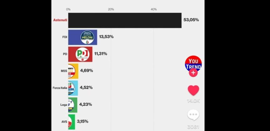 Questo è il dato dell'astensione confrontato al voto delle scorse europee. È un numero che fa impressione e che dovrebbe essere oggetto di attenta riflessione. Il 53% di astenuti per delle elezioni nazionali non ha nulla di fisiologico. E anzi, a me pare che indichi in primo luogo una profonda crisi democratica e in secondo luogo un impoverimento politico-culturale tendente al peggioramento, come su di un piano inclinato che ci trascina inesorabilmente verso il basso, verso cioè una condizione che favorisce la legge del più forte e dunque le destre.