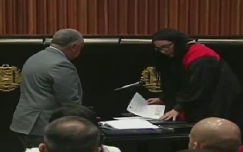Caryslia Rodríguez, presidente della magistratura, era incaricata di ricevere Amoroso presso la sede del TSJ. Hanno anche firmato un documento per la consegna dei verbali e di altri "documenti legali di rilevanza giuridica".