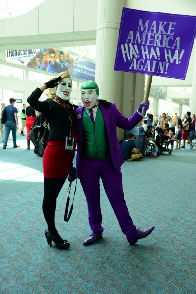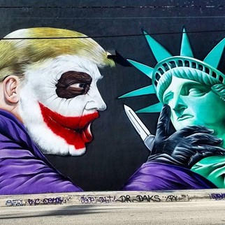 Basato sulla figura del pagliaccio malefico, Joker è uno dei supercriminali più famosi della storia dei fumetti, nonché la nemesi del Cavaliere Oscuro[5]. Presentato come uno psicopatico con un senso dell'umorismo contorto e sadico. Così la presentazione del personaggio su Wikipedia. E’ la personificazione di Donald Trump.