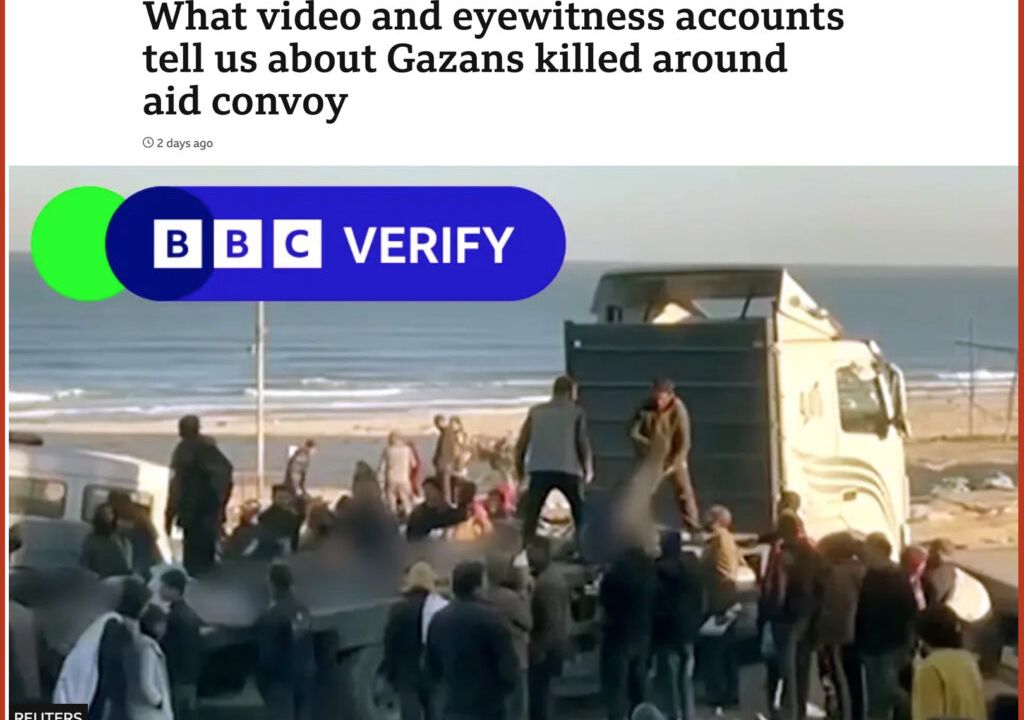 Infine, un’attenta analisi della BBC ha smentito in maniera definitiva la propaganda israeliana, che ha tentato di eludere le responsabilità sulla strage della farina accreditandola a cause accidentali, cioè la calca e le manovre impazzite dei camion.