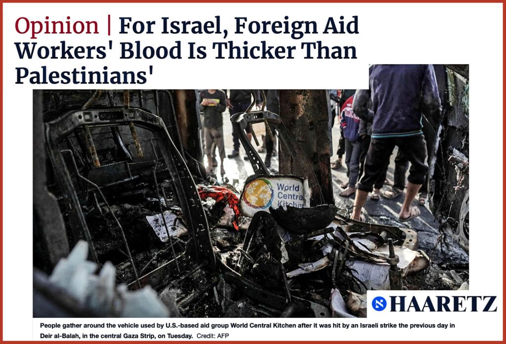 Riportiamo un articolo di Gideon Levy dal titolo: “Per Israele, il sangue degli operatori umanitari stranieri è più denso di quello dei palestinesi”, pubblicato su Haaretz e dedicato all’eccidio dei 7 operatori sanitari della World Central Kitchen. Dove il denso va interpretato, riteniamo, che quando viene versato non è come quello dei palestinesi, che può sgorgare a fiumi…