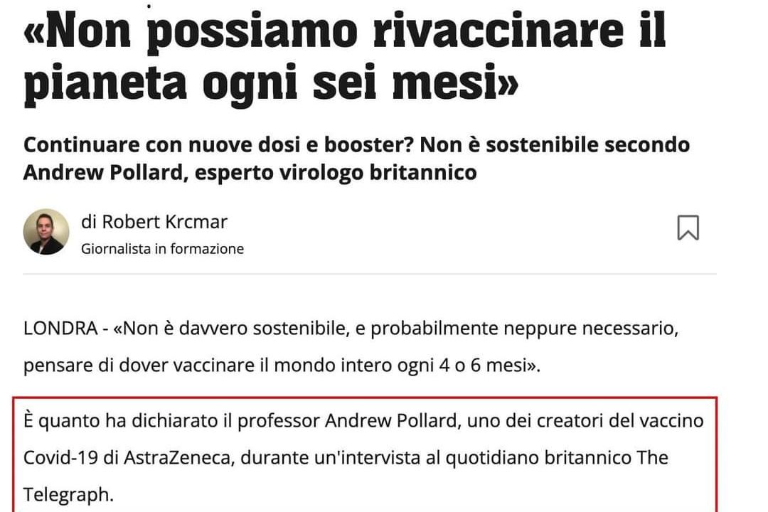 "Mentre il governo italiano fa chiaramente intendere di voler utilizzare il green pass per obbligare la popolazione a richiami vaccinali continui - trasformandolo da strumento "emergenziale" in misura strutturale -, uno degli inventori del vaccino AstraZeneca prende posizione contro il delirio della vaccinazione permanente di massa." (Thomas Fazi)