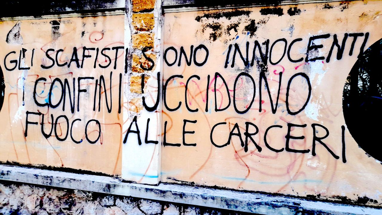 “Fuoco alle carceri”. Immagino, visto il contenuto delle frasi precedenti, si riferisca ai centri di detenzione in Libia. Certamente, vanno chiusi. Per quanto “ospitino” solo alcune migliaia di “migranti” in Libia su un totale di 700.000 e fuori dai centri spesso sia peggio che dentro, in quanto in Tripolitania vige un sistema di produzione esteso basato sulla schiavitù che coinvolge tutto il sistema produttivo e non solo i centri di detenzione. Tuttavia sarebbe importante far notare al ragazzino della scritta che quei centri di detenzione sono gestiti da milizie (spesso le loro caserme dove sono raccolte le armi e i centri di detenzione dei migranti sono la stessa cosa) che non hanno fermato la migrazione, l‘hanno moltiplicata, attirando con l‘inganno centinaia di migliaia di ragazzini ignari nella trappola. E che quelle stesse milizie sono appoggiate dall’Europa quindi, non per fermare la migrazione (gli schiavi fanno comodo a tutti), ma per saccheggiare il petrolio libico.