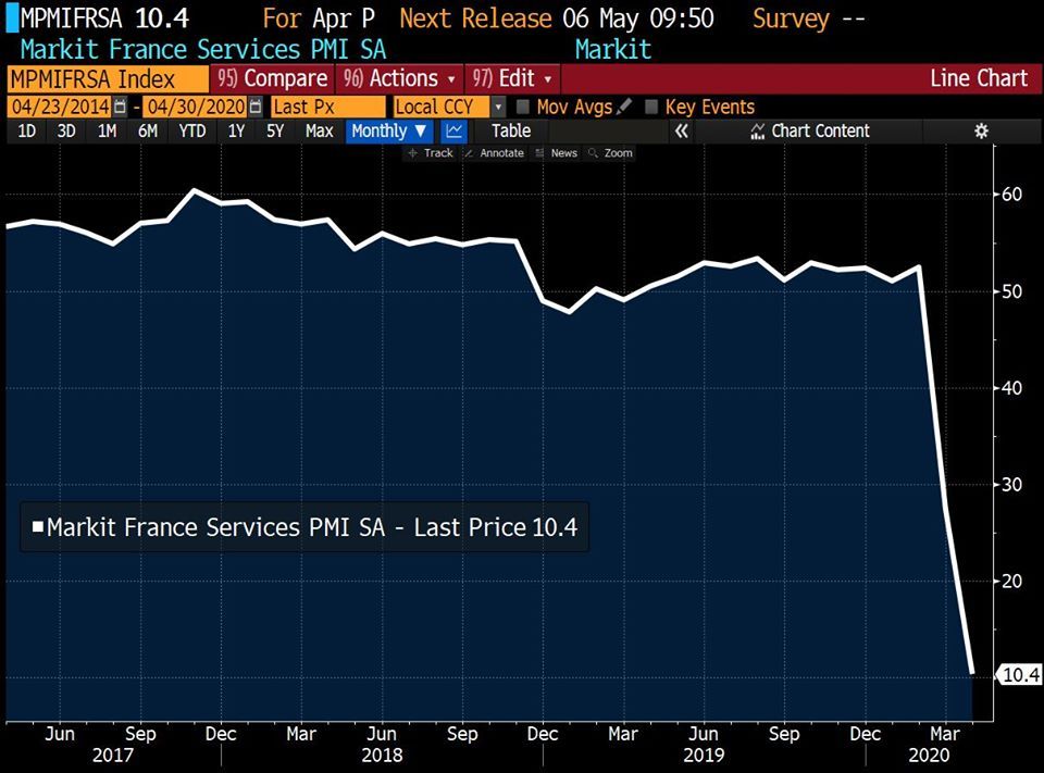 L'indice PMI - Purchasing Managers Index che analizza le attività economiche (ordini, acquisti, manifattura, produzione, etc.) delle aziende manifatturiere, partendo da un 50 neutro, sopra i 50 indica crescita ed espansione economica, mentre sotto indica contrazione - in Francia registra un crollo incredibile oggi fino al 10.4. Nel 2009 in piena crisi subprime non era mai sceso sotto i 40 punti.