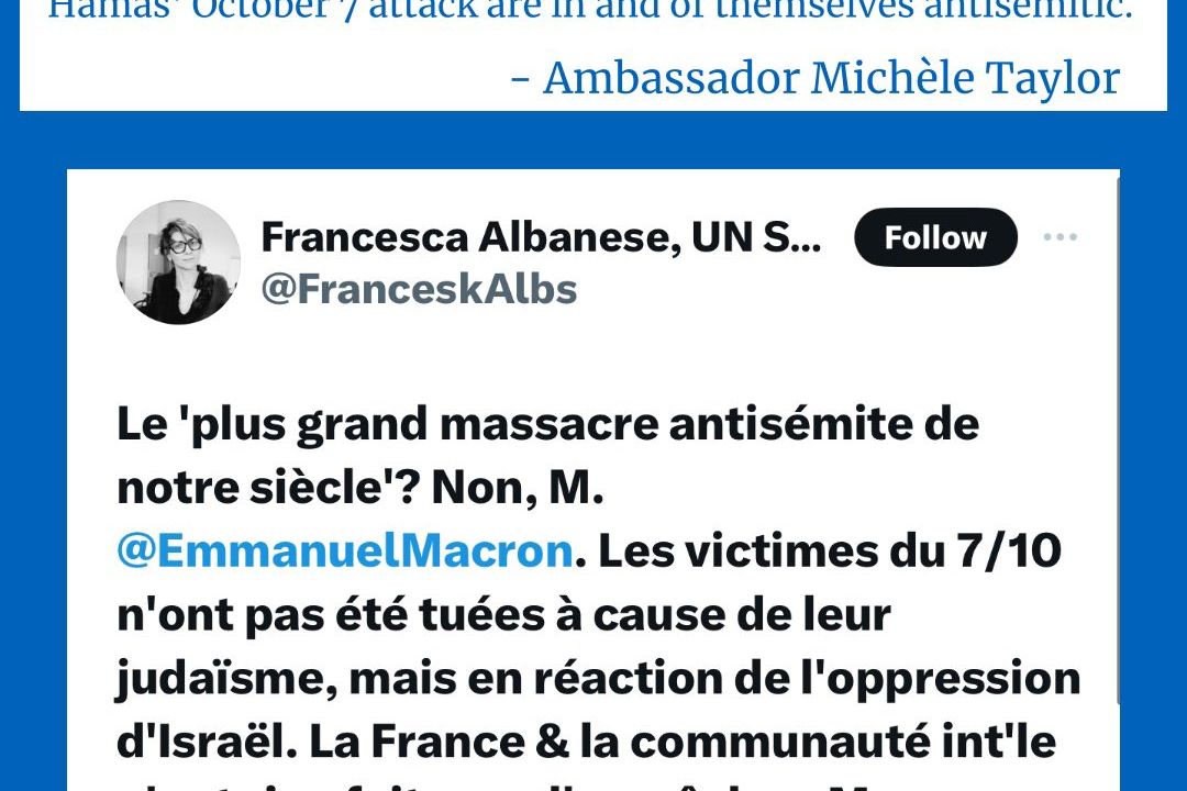 Michele Taylor, rappresentante permanente degli Stati Uniti presso il Consiglio per i diritti umani delle Nazioni Unite, ha accusato la relatrice speciale dell'ONU per la Palestina, Francesca Albanese, di "utilizzare da sempre troppe espressioni antisemite".