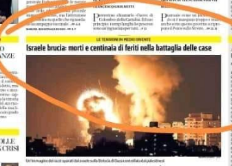 Israele brucia, ma nella didascalia viene specificato che l'immagine di distruzione è relativa a Gaza. A bruciare è il bantustan palestinese, circondato, isolato come un immenso lager a cielo aperto.