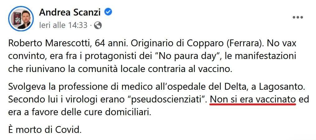 La fake news diffusa da Andrea Scanzi, giornalista de il Fatto Quotidiano, riguradante il medico ferrarese Roberto Marescotti morto di Covid è clamorosa e la analizza alla perfezione il deputato di Alternativa nel post Facebook che vi pubblichiamo per intero in calce. Quello che ci preme sottolineare è che questa enorme bufala è totalmente sfuggita a quegli attenti e imparziali censori dei social, in particolare Open, i quali hanno prima bloccato e poi oscurato la nostra pagina per un post ironico che ridicolizzava le loro menzogne.