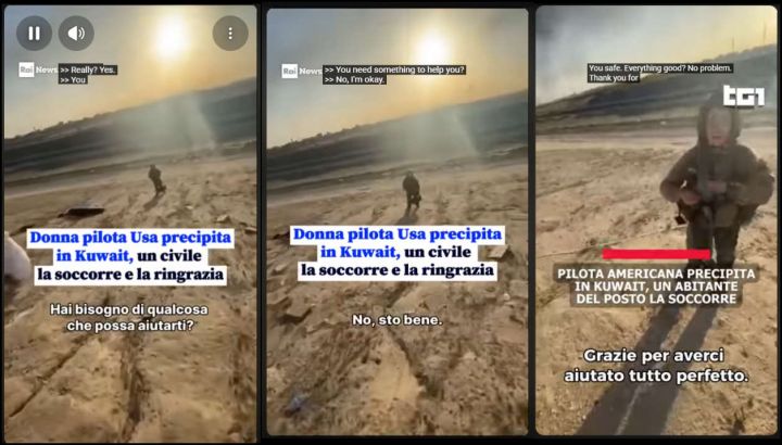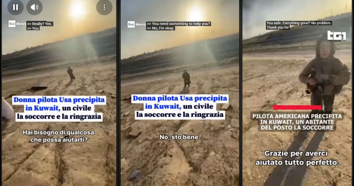 Ancora più strampalato il video-fake “Donna pilota americana precipita in Kuwait, un civile la soccorre e la ringrazia“, già virale (grazie a Repubblica), che mostra una top gun USA (presumibilmente, ha dovuto abbandonare il suo caccia F15E, “colpito per errore”) raggiunta da un tizio che, già a decine di metri di distanza, le si rivolge in lingua inglese: “…va tutto bene, qui sei al sicuro. Grazie del tuo aiuto.” Certo, durante una guerra possono succedere cose strane. Ma non sarebbe stata più logica la domanda: “Che è successo?” Ma vuoi vedere che, tutti i giorni in Kuwait, gli aerei Usa vengono abbattuti dalla contraerea ?