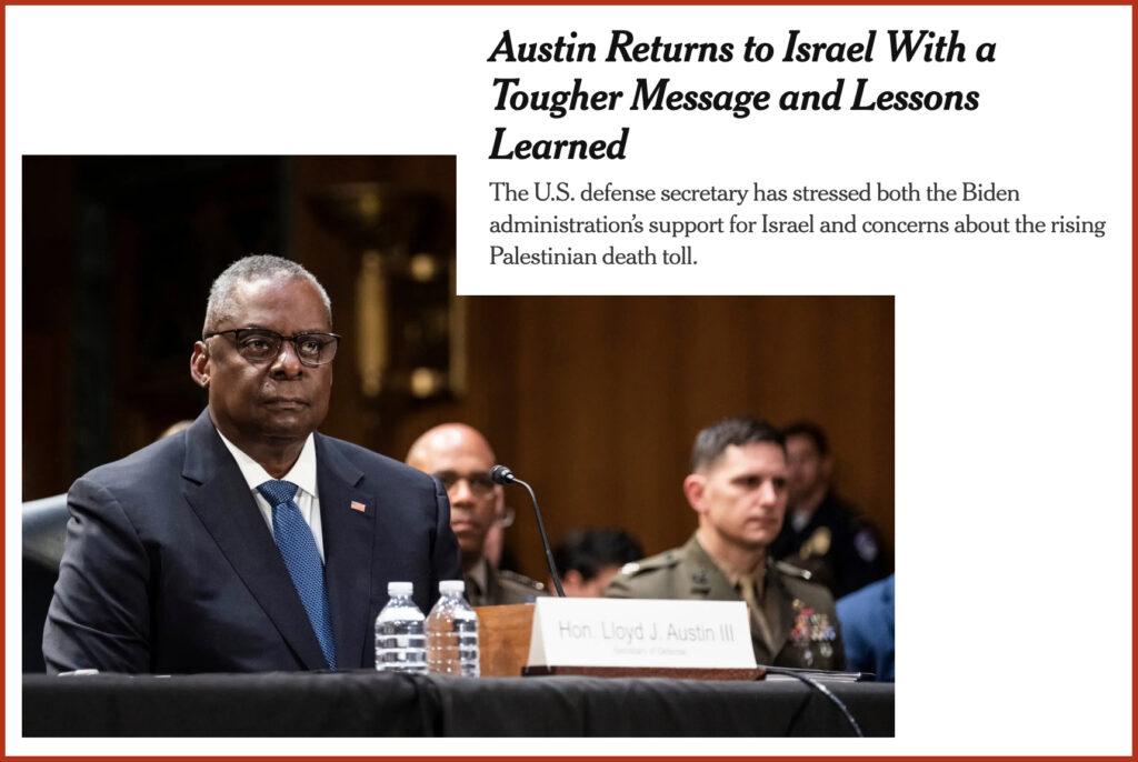 Il Segretario della Difesa Usa Lloyd Austin è volato in Israele. Segue di qualche giorno la visita del Consigliere per la Sicurezza nazionale Sullivan. Evidentemente il messaggio di Sullivan, inviato in loco per tentare di frenare la brutalità dell’attacco a Gaza, se non arrestarlo, non è stato affatto recepito dalla controparte, da cui il nuovo tentativo, che denota insistenza, D’altronde i democratici rischiano di alienarsi voti preziosi in vista delle presidenziali.