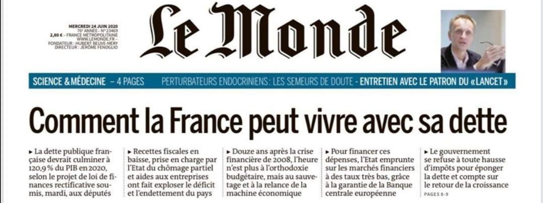 Ecco, oggi abbiamo un'articolo interessante: "Come può la Francia vivere con il suo debito". Bene, in questo articolo si dice chiaro e tondo che con un debito al 120% del pil a fine 2020 (peraltro secondo le proiezioni odierne del Fmi sarà più alto ancora) l'unico modo è con una Bce che garantisca tassi d'interesse bassi.