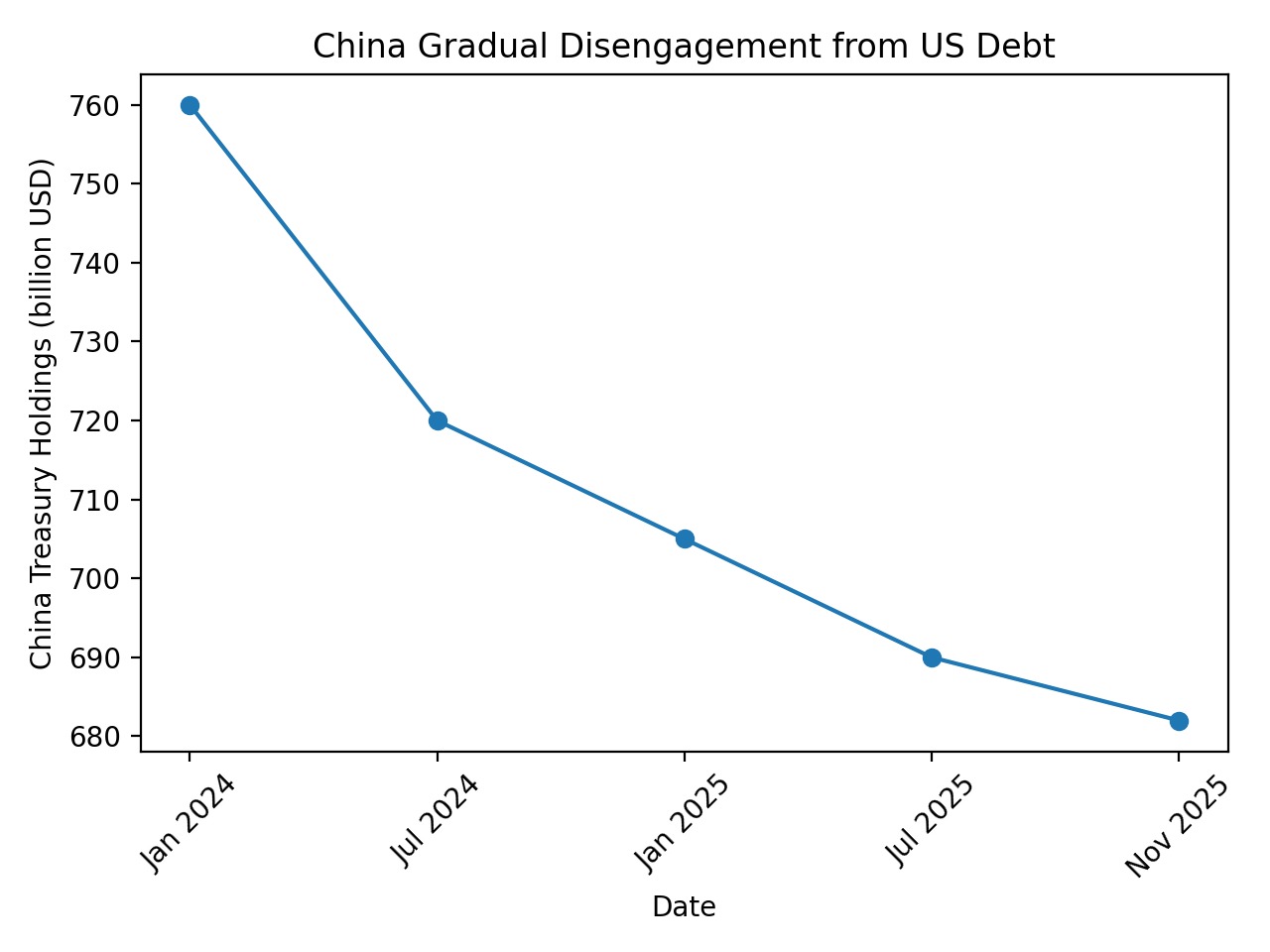 I dati più recenti disponibili sulle detenzioni cinesi di Treasury mostrano una traiettoria coerente con un disimpegno graduale: