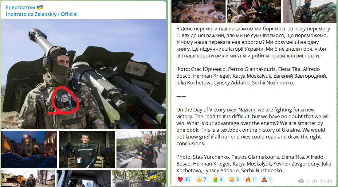Il messaggio originale di Zelensky per il giorno della vittoria dell'Unione Sovietica sul nazismo, con una foto di un soldato di Kiev con un T0t3nk0pf (un teschio con due ossa incrociate), simbolo usato da diverse unità militari della Germania nazista. Zelensky ha poi rimosso il post sia da Telegram che da Instagram: "Nel giorno della vittoria sul nazismo, stiamo combattendo per una nuova vittoria. La strada per arrivarci è difficile, ma non abbiamo dubbi che vinceremo. Qual è il nostro vantaggio sul nemico? Siamo più intelligenti per via di un libro. Questo è il libro di testo sulla storia dell'Ucraina. Non conosceremmo il dolore se tutti i nostri nemici potessero leggere e trarre le giuste conclusioni".