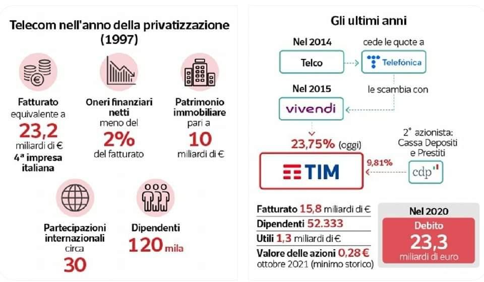 Prima di essere svenduta ai privati, Telecom era il 6° operatore al mondo, fatturava 23,2 miliardi, dava lavoro a 120.345 persone, non aveva debiti, vantava 30 partecipazioni internazionali e un patrimonio immobiliare di 10 miliardi.