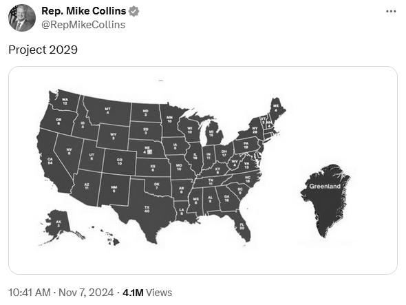 In molte redazioni del mondo ha destato scalpore il fatto che il deputato americano Mike Collins abbia condiviso un immagine dei collegi elettorali degli Stati Uniti che comprendeva anche la Groenlandia. Il “meme” del deputato peraltro recava la dicitura Project 2029 quasi a segnalare che la “conquista” americana della Groenlandia è un progetto politico già predisposto.