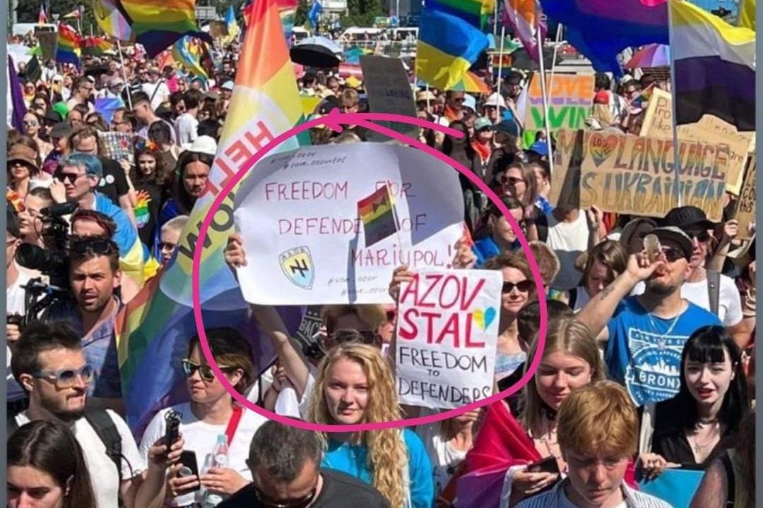La deriva del movimento Lgbtq in occidente. Dal rifiuto di ogni positivo valore patriottico, dallo slogan "Confini aperti come i nostri culi", si è passati ad abbracciare l'ultranazionalismo filo-nazista e il razzismo russofobo.