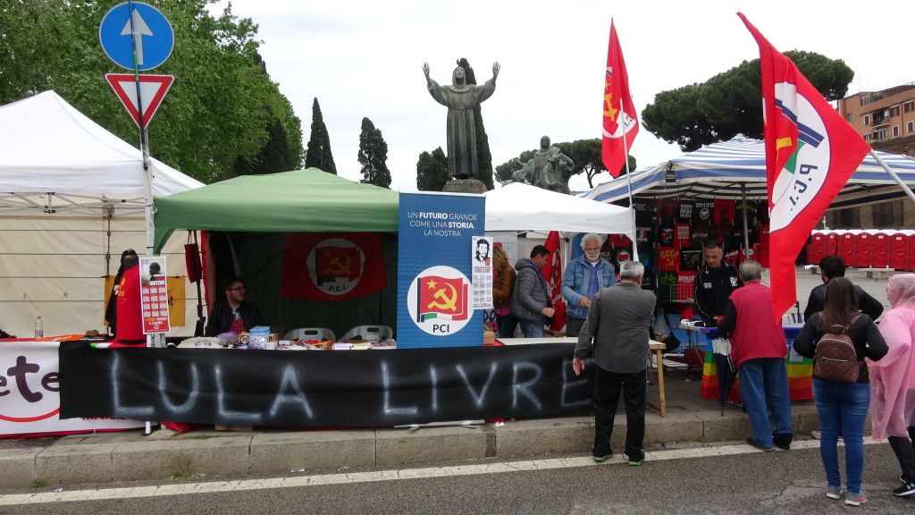 Il Primo Maggio eravamo in piazza San Giovanni a Roma, con il nostro presidio che facciamo ogni anno, in occasione del concertone organizzato dalla triade CGIL – CISL -UIL. Durante la giornata passano dei compagni brasiliani con uno striscione sul compagno Lula, recitava: “LULA LIVRE”.