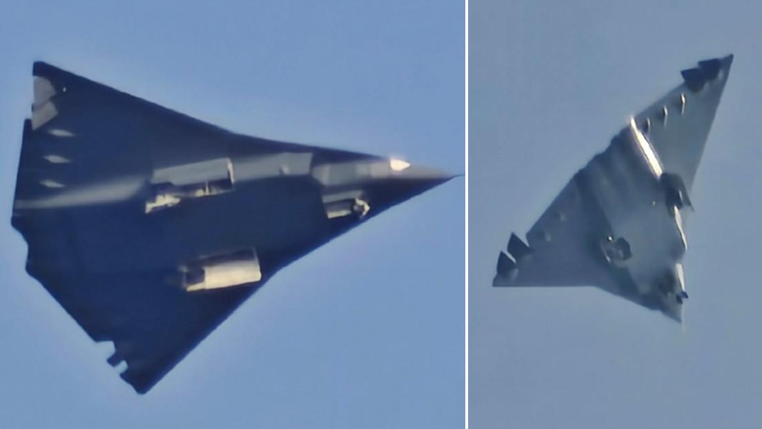 Le immagini rivelano un velivolo con tre motori - due posizionati sotto la fusoliera e uno nella parte superiore - e prese d'aria laterali e superiori. La configurazione include un carrello di atterraggio principale con doppie ruote e freni aerodinamici suddivisi. Questi dettagli suggeriscono un progetto avanzato con caratteristiche aerodinamiche all'avanguardia e prestazioni elevate.