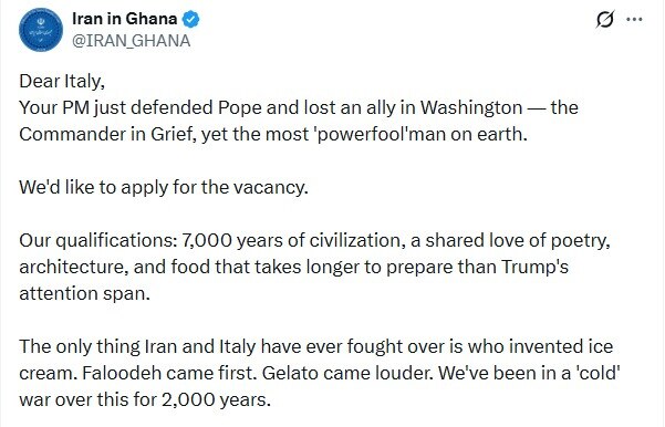 Nuova mossa ironica della diplomazia iraniana dopo le critiche del Presidente degli Stati uniti d'America, Donald Trump al Primp Ministro italiano, Premier Giorgia Meloni.