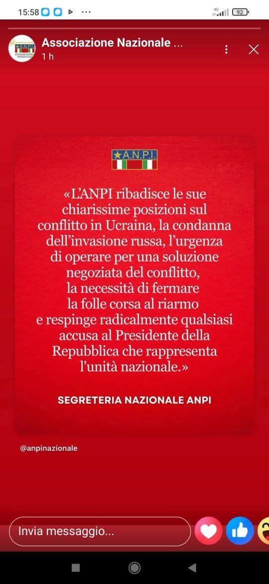 «L’ANPI ribadisce le sue chiarissime posizioni sul conflitto in Ucraina, la condanna dell’invasione russa, l’urgenza di operare per una soluzione negoziata del conflitto, la necessità di fermare la folle corsa al riarmo e respinge radicalmente qualsiasi accusa al Presidente della Repubblica che rappresenta l’unità nazionale.